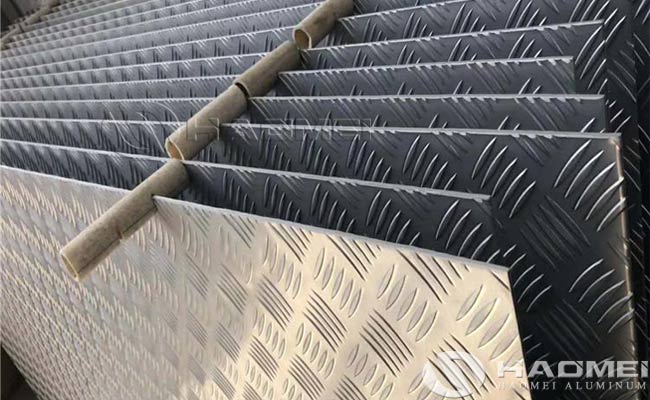 The 5 bar diamond plate aluminum is mainly used for non-slip and anti-skid on the ground, such as elevators, footboards, movable room floors, vehicles, ships and other industries. Haomei Aluminum is a professional aluminum diamond plate manufacturer who supply 1060, 3003, 5052 aluminum tread plate with thickness of 0.66-10mm, width 1000-1220mm, we can provide anodizing treatment on the diamond aluminum plate and has a longer service life. Besides Haomei provide orange peel embossed aluminum coil, pebbles embossed hammered mirror reflection aluminum plate and aluminum coil, rhombus embossed aluminum sheet, semi-circular spherical pressed aluminum plate. Various widths and lengths can be processed to length.